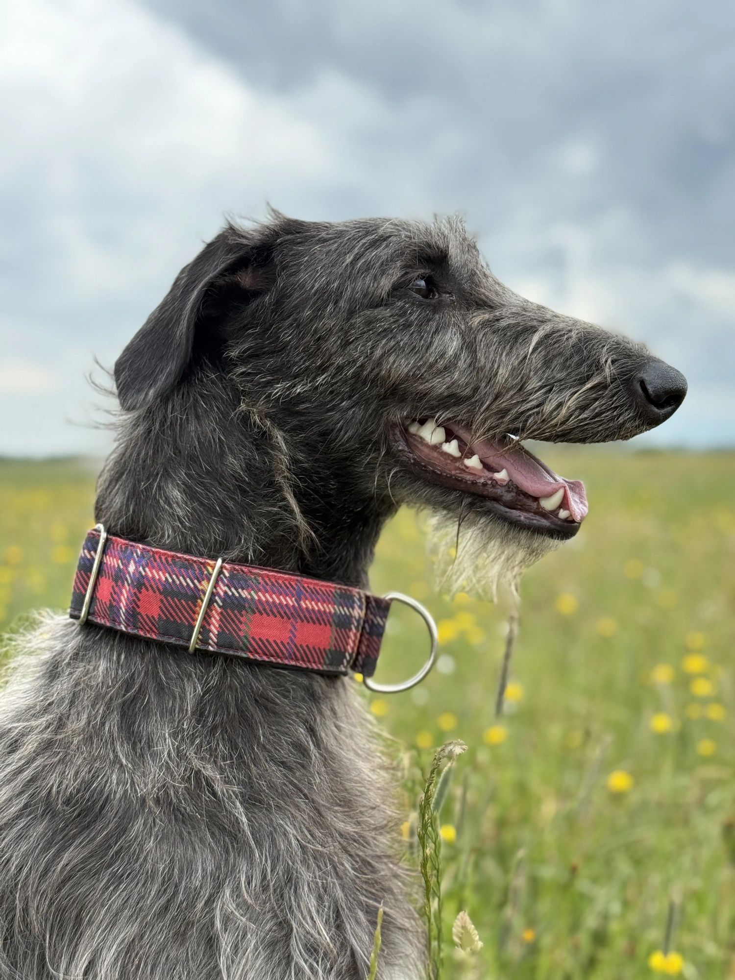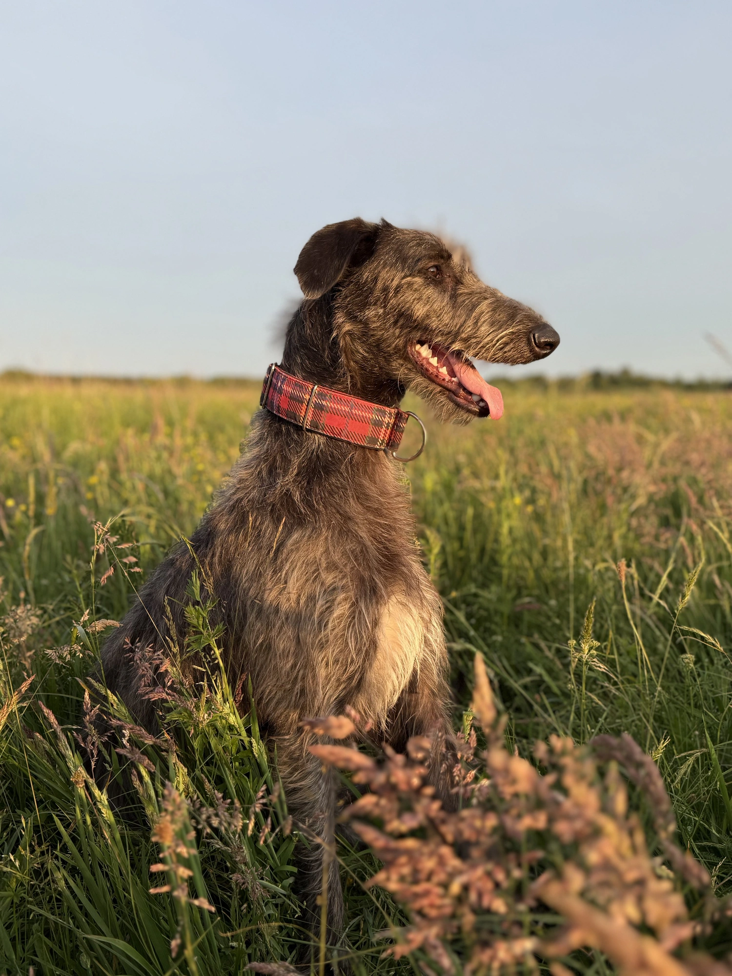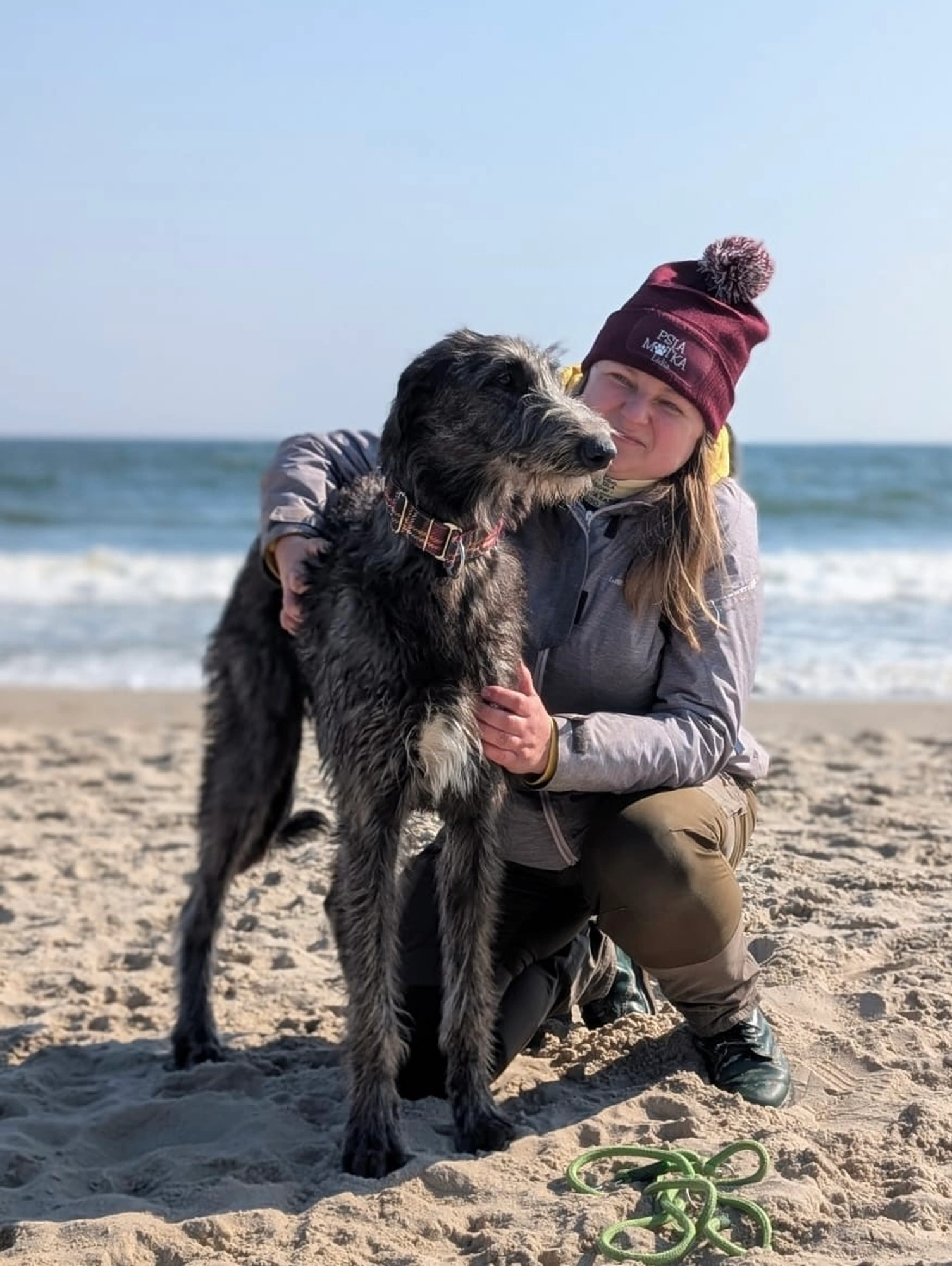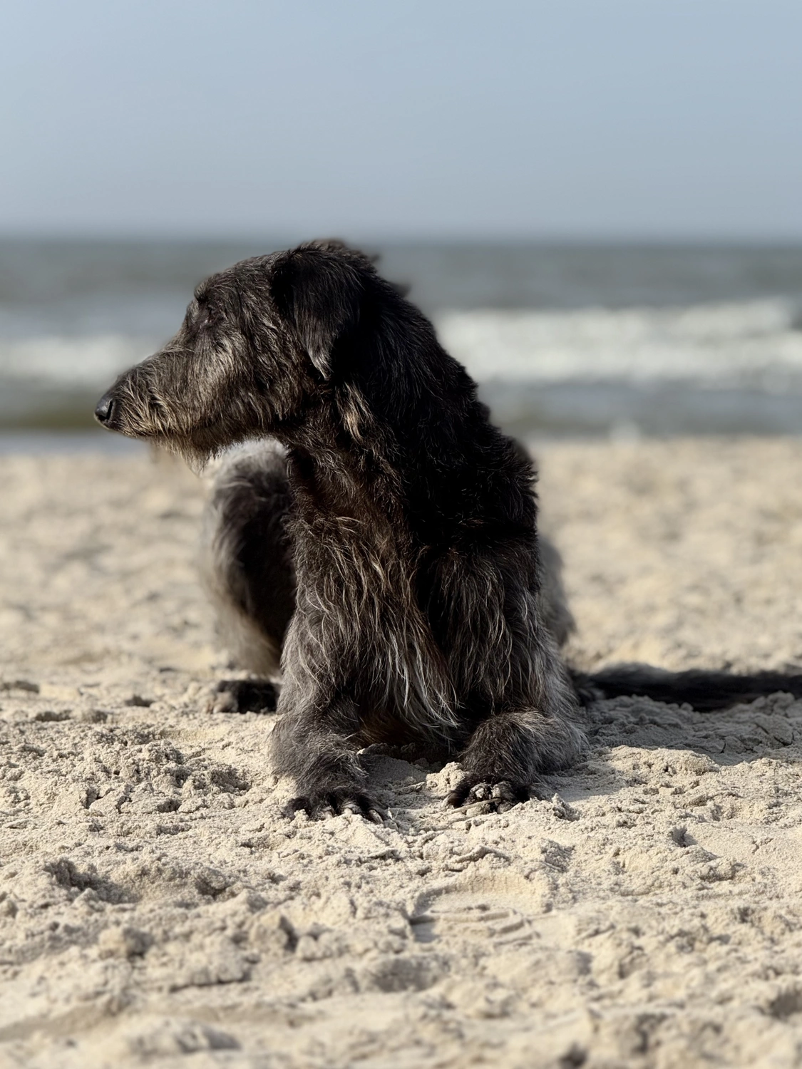Gaja dołączyła do nas w grudniu 2025, gdy miała już 5 miesięcy. Jest zdecydowanie najbardziej energicznym deerhoundem w naszym stadzie, kochającym… bieganie w wodzie. Jeśli tylko na swojej trasie spacerowej znajdzie rzeczkę, jezioro czy choćby wielką kałużę, Gaja z pewnością urządzi sobie w niej charci sprint, z zadowoleniem rozchlapując wodę dookoła. Lubi też zapraszać inne psy do charcich zabaw, co nie zawsze jest przez nie rozumiane. Kocha biegać i jeśli tylko któreś z naszej psiej ekipy zaproponuje jej berka, Gaja nie odmówi. Nie odmówi też… wspólnego oglądania telewizji z człowiekiem, zwłaszcza jak człowiek będzie jednocześnie ją głaskał i drapał po grzbiecie.