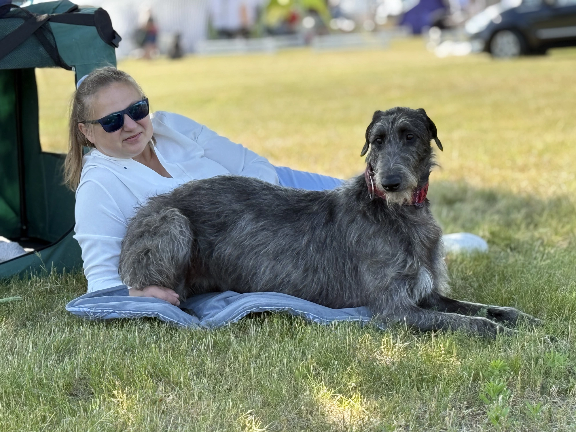 Eksterierowo Gaja różni się od pozostałych moich deerhoundów - jest innego typu: lżejszej budowy, smuklejsza, o mniej obfitej szacie. Jej uroda została doceniona w maju 2025 podczas prestiżowej wystawy Europasieger w Dortmundzie, a także na innych wystawach polskich i zagranicznych, gdzie Gaja wybiegała sobie młodzieżowe championaty.
